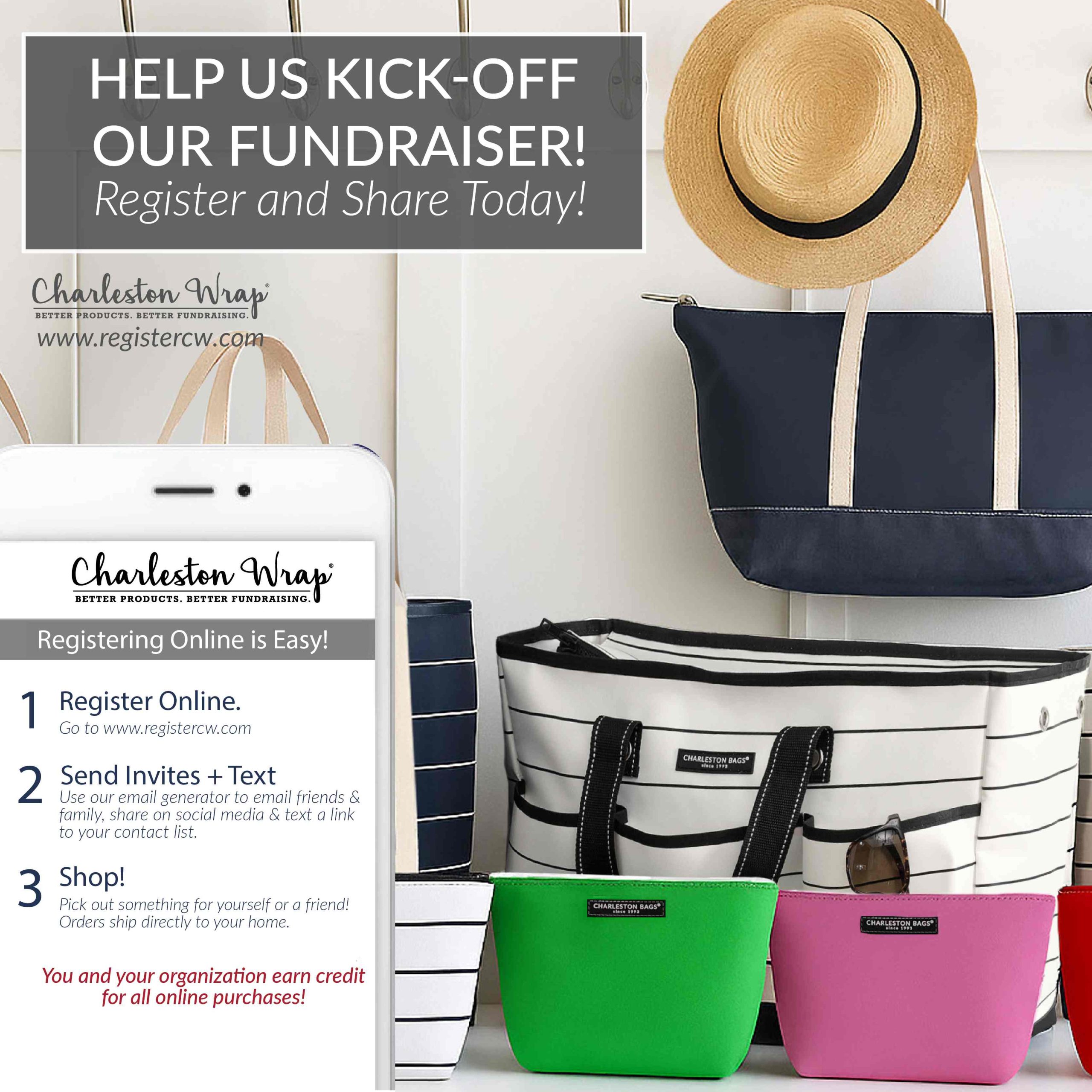 Recommended Post Text: REMINDER! Register today for our Charleston Wrap fundraiser at www.registercw.com! After registering, you can send email and text invitations to friends and family. Your shares will help us reach our fundraising goal. Would you help kick off our fundraiser by registering today and sharing with 10 friends and family? #charlestonwrap #fundraiser #gift #birthday #wedding #hostess #homedecor #candle #bath #spa #charlestonbags #personalizedgift #homegoods #kitchen #chocolate #cookie #gourmet #belpiatto #fundraising #charlestonwrapfundraiser