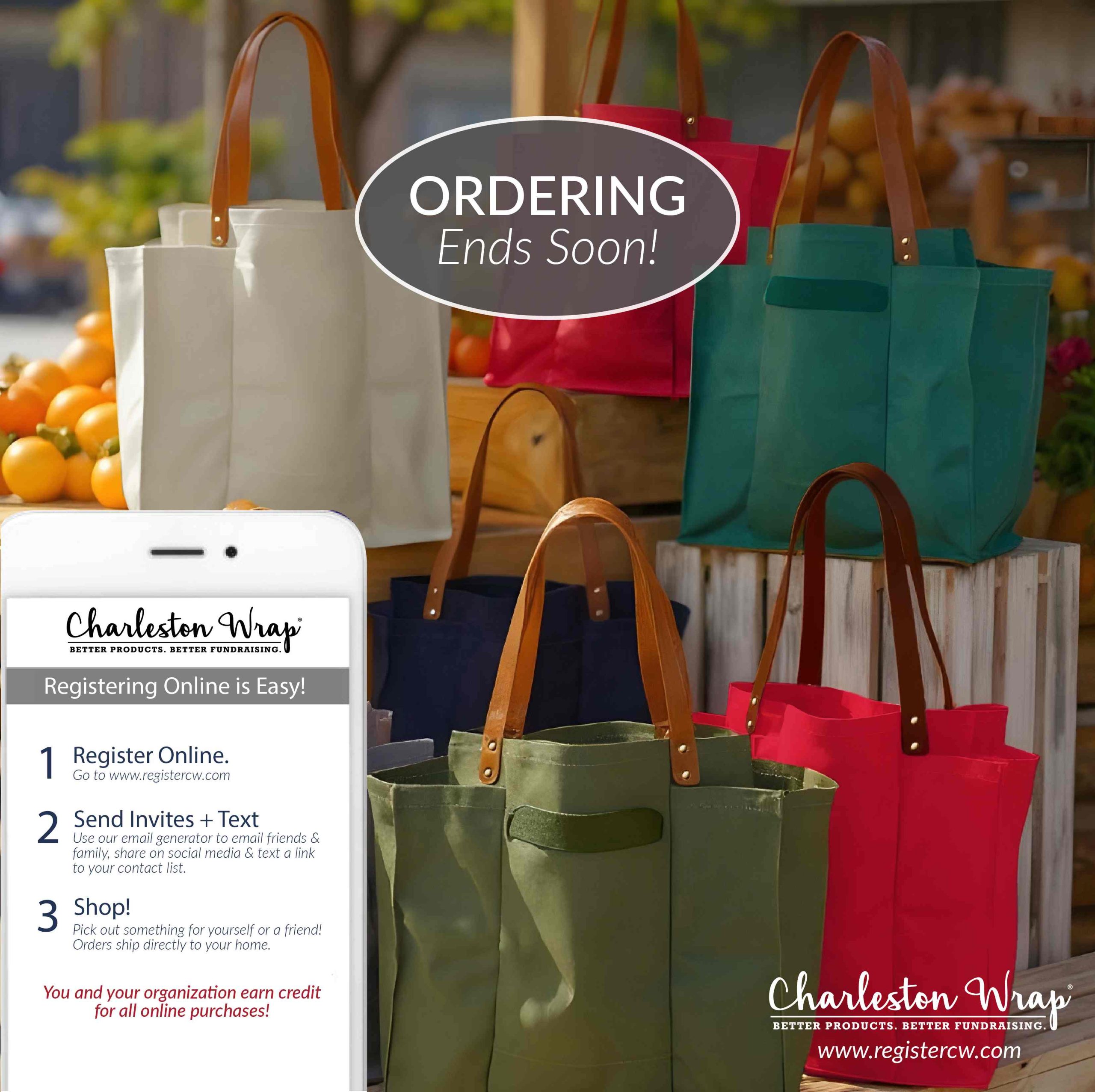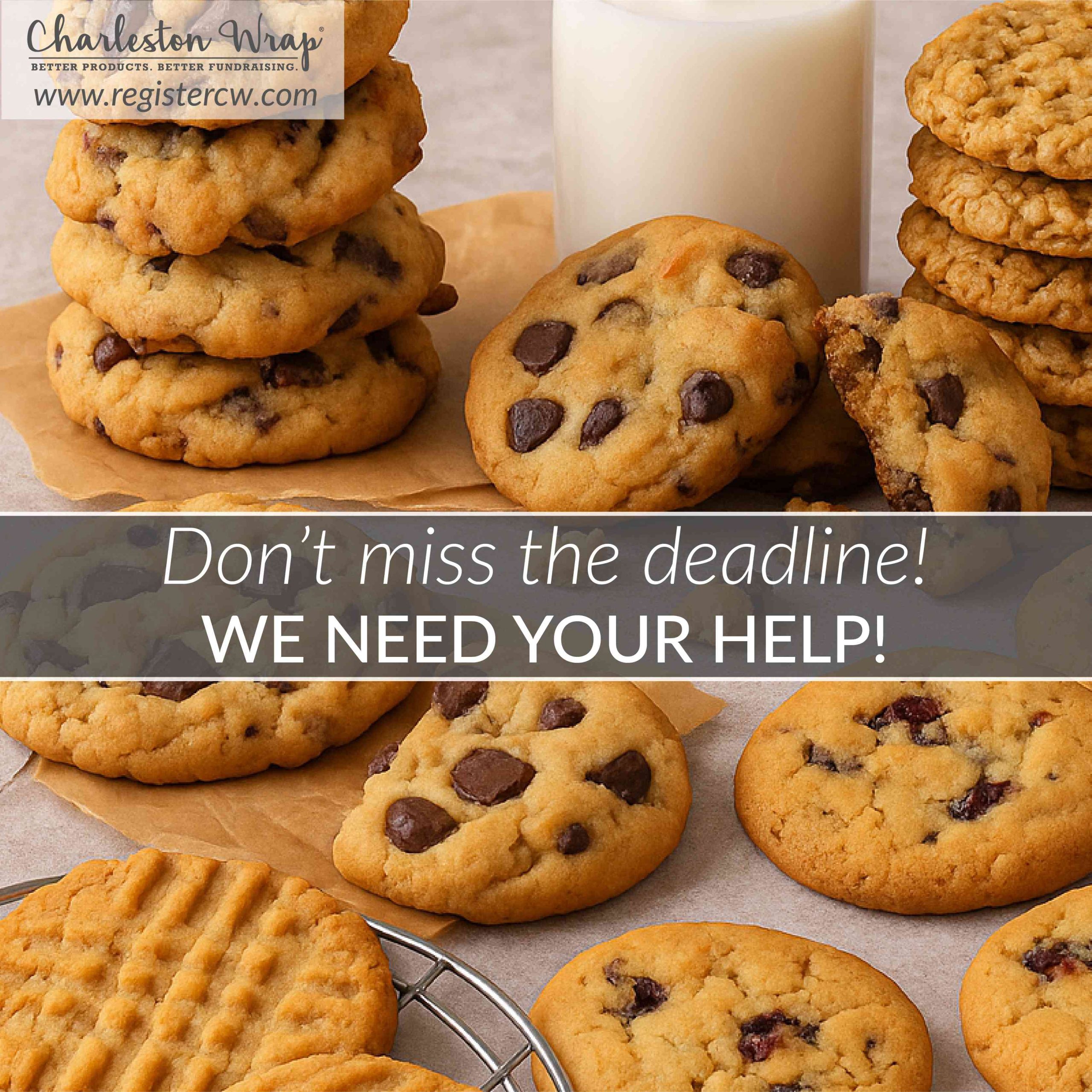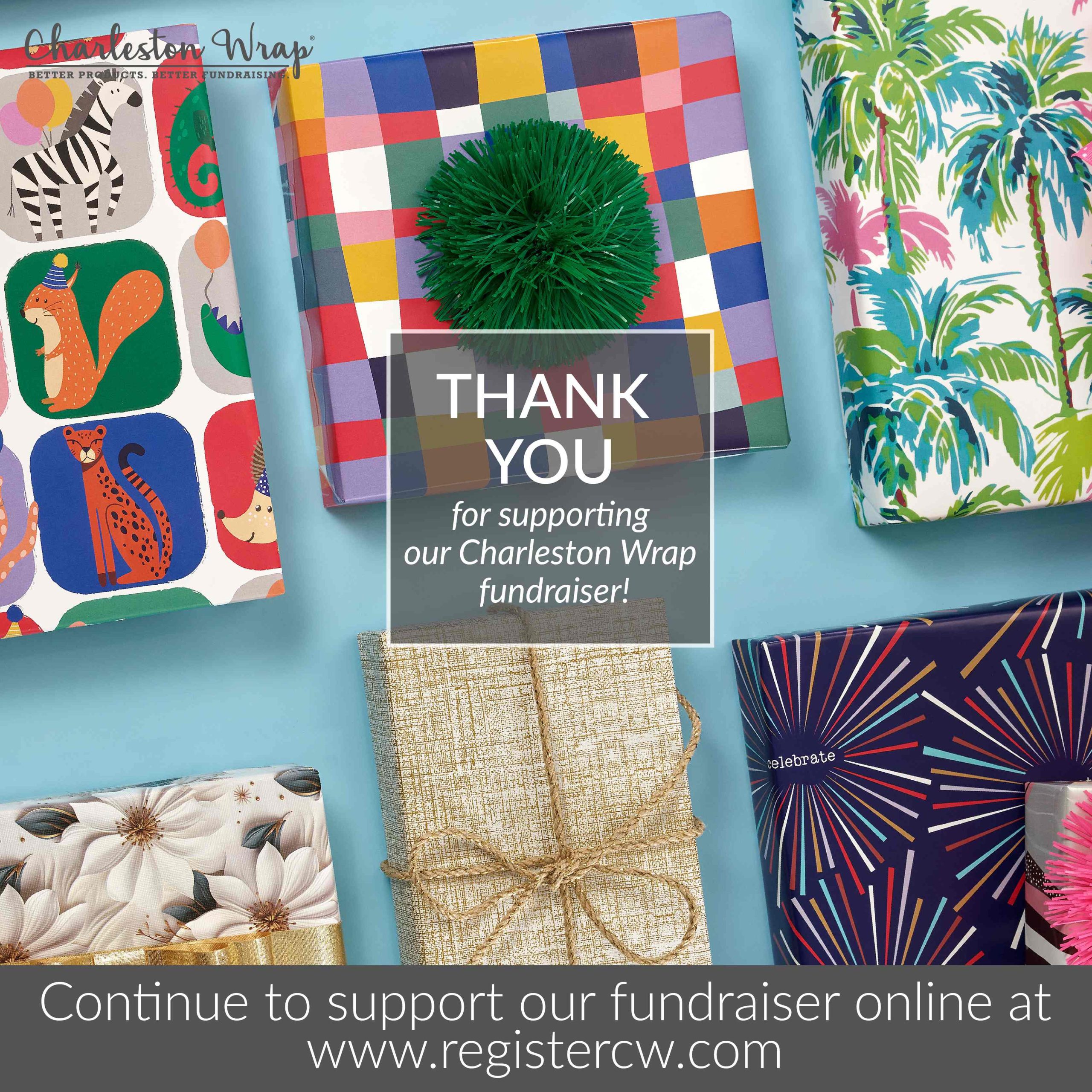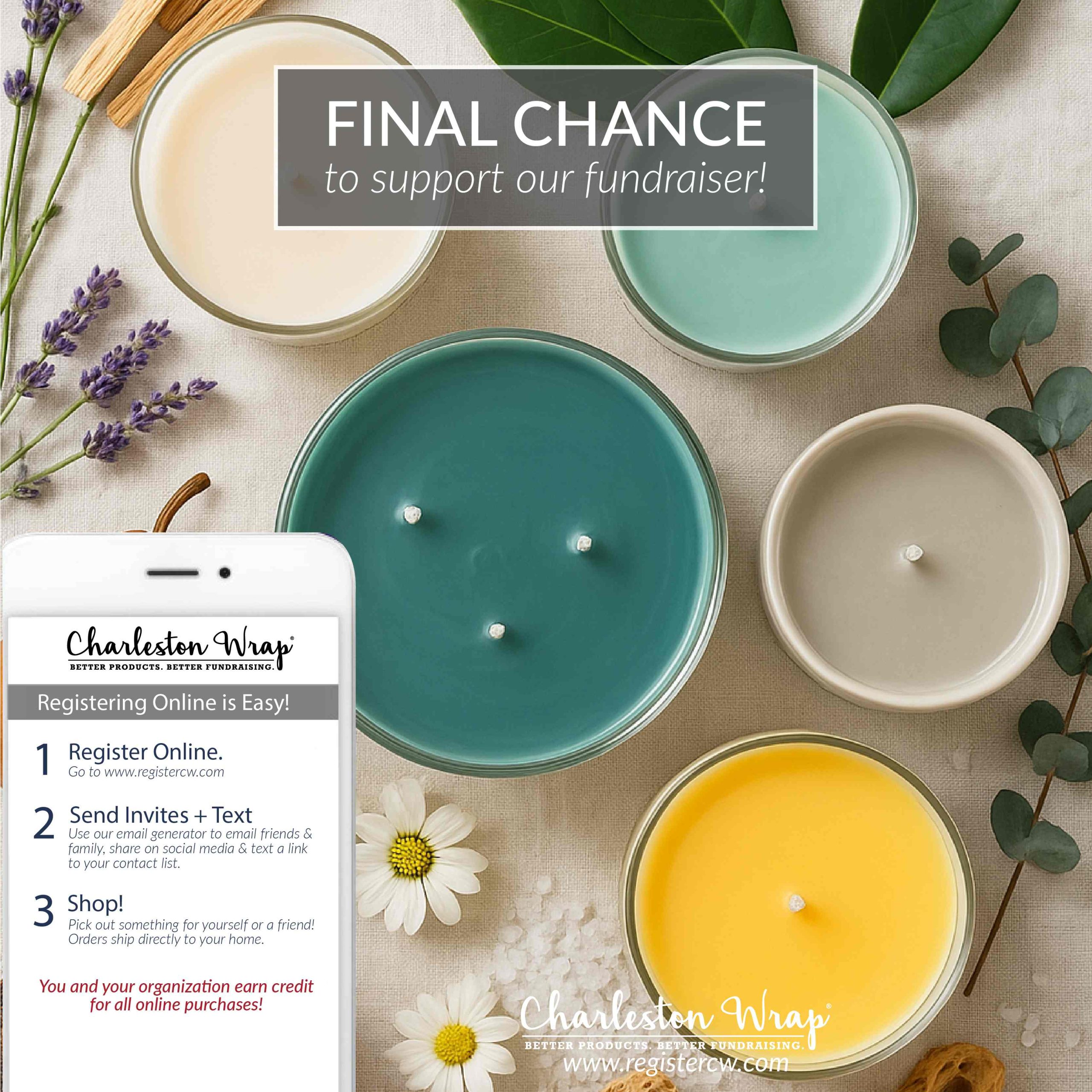 Recommended Post Text: Our fundraiser deadline has been EXTENDED to ____! Register, shop, and share at www.registercw.com. Please help spread the word through email, text, and social media. We’re counting on your support to reach our final goal. Thank you to everyone who has participated in our fundraiser so far! #charlestonwrap #fundraiser #gift #birthday #wedding #hostess #homedecor #candle #bath #spa #charlestonbags #personalizedgift #homegoods #kitchen #chocolate #cookie #gourmet #belpiatto #fundraising #charlestonwrapfundraiser