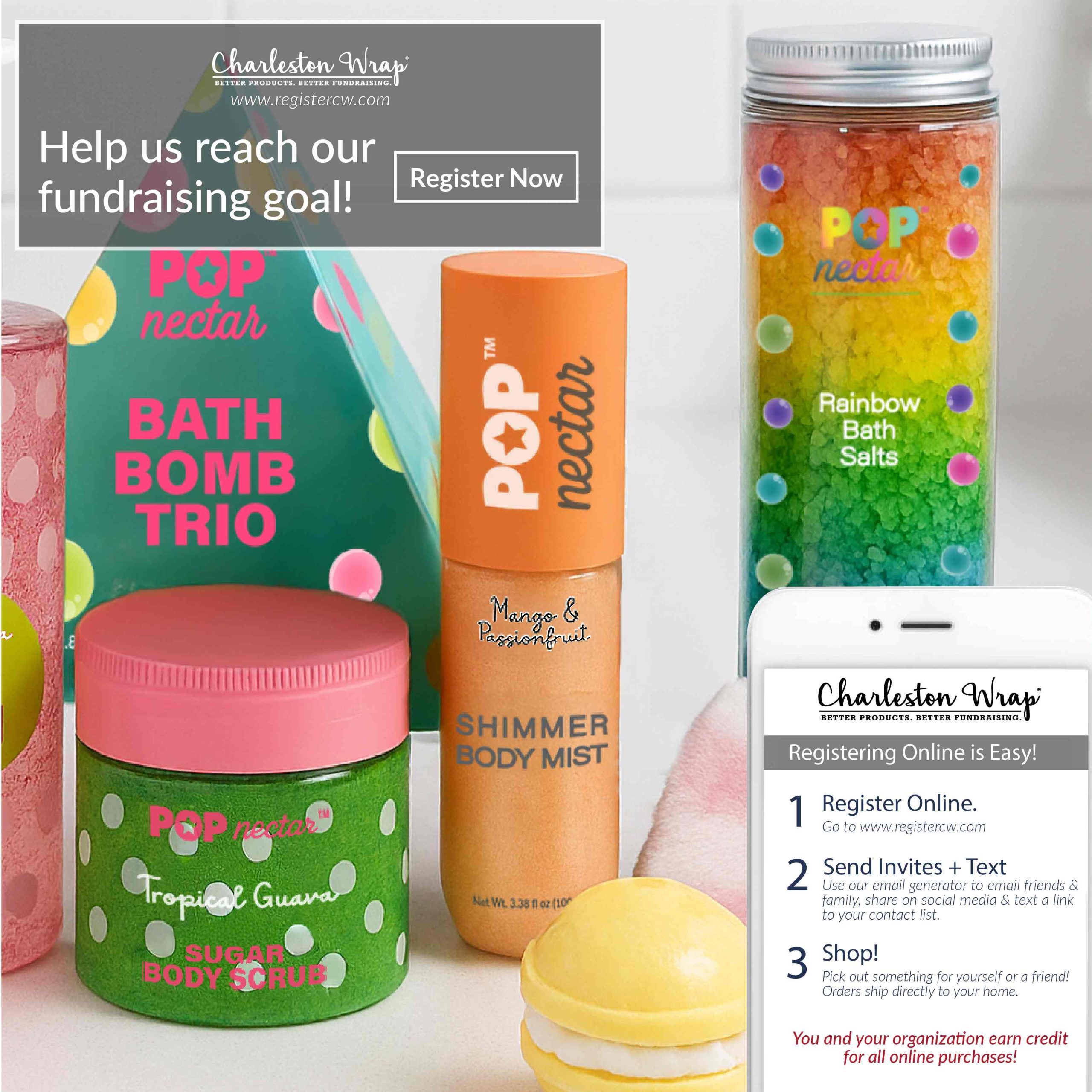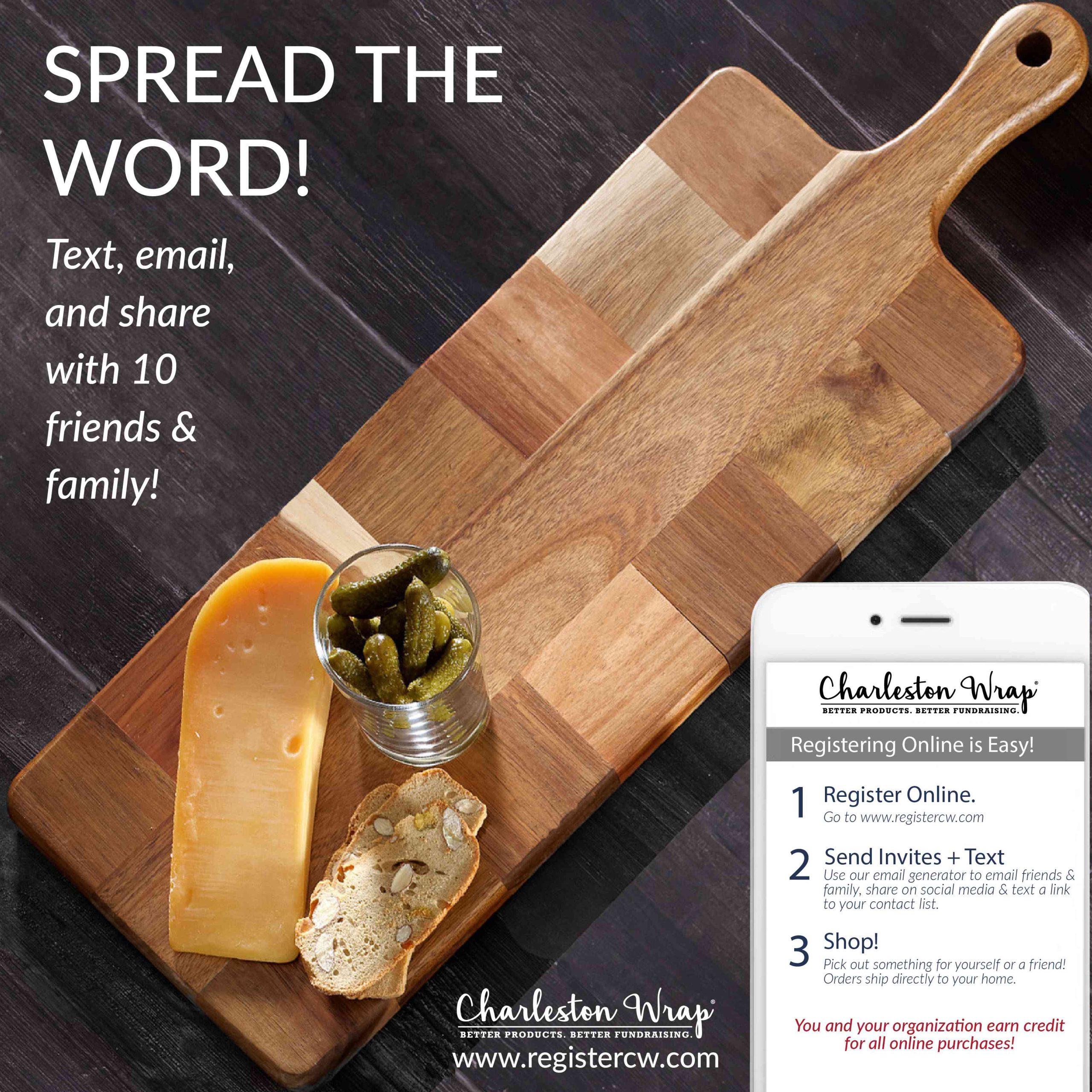 Recommended post text: Our Charleston Wrap fundraiser kicks off today! Our fundraising goal is $____. With over 2,500 gift ideas, there’s something for everyone—whether you’re shopping for birthdays, Mother’s Day, Teacher Appreciation, or Father’s Day. Register online today at www.registercw.com and help spread the word! Share our fundraiser through email, text, and social media with at least 10 friends and family. Remember: sharing is caring! #charlestonwrap #fundraiser #gift #birthday #wedding #hostess #homedecor #candle #bath #spa #charlestonbags #personalizedgift #homegoods #kitchen #chocolate #cookie #gourmet #belpiatto #fundraising #charlestonwrapfundraiser